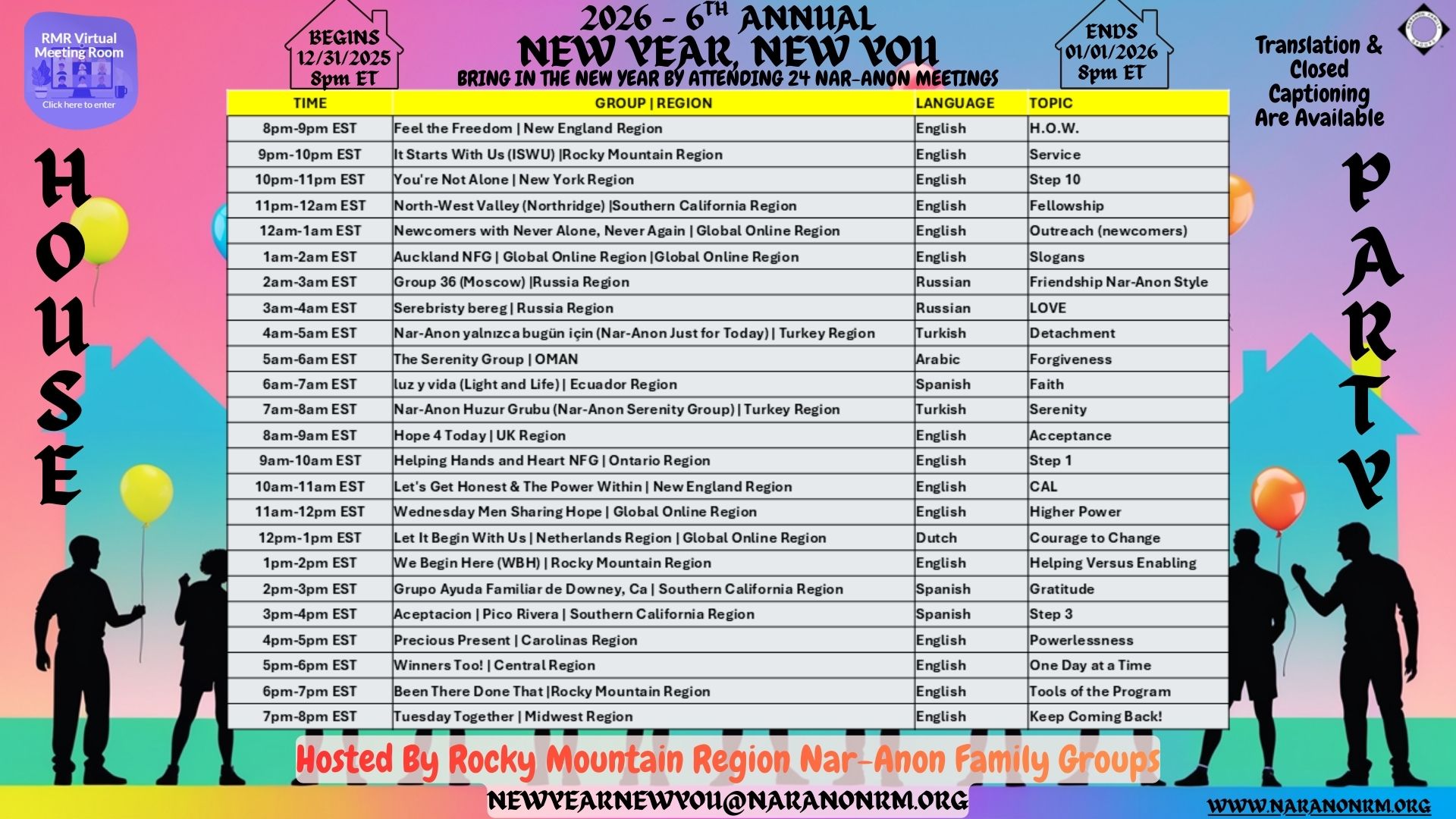 The Rocky Mountain Region is excited to host the 6th annual New Year, New You House Party, a 24-hour global celebration of recovery, connection, and hope. This special event will take place from 8:00 PM ET on December 31, 2025 through 7:00 PM ET on January 1, 2026.
